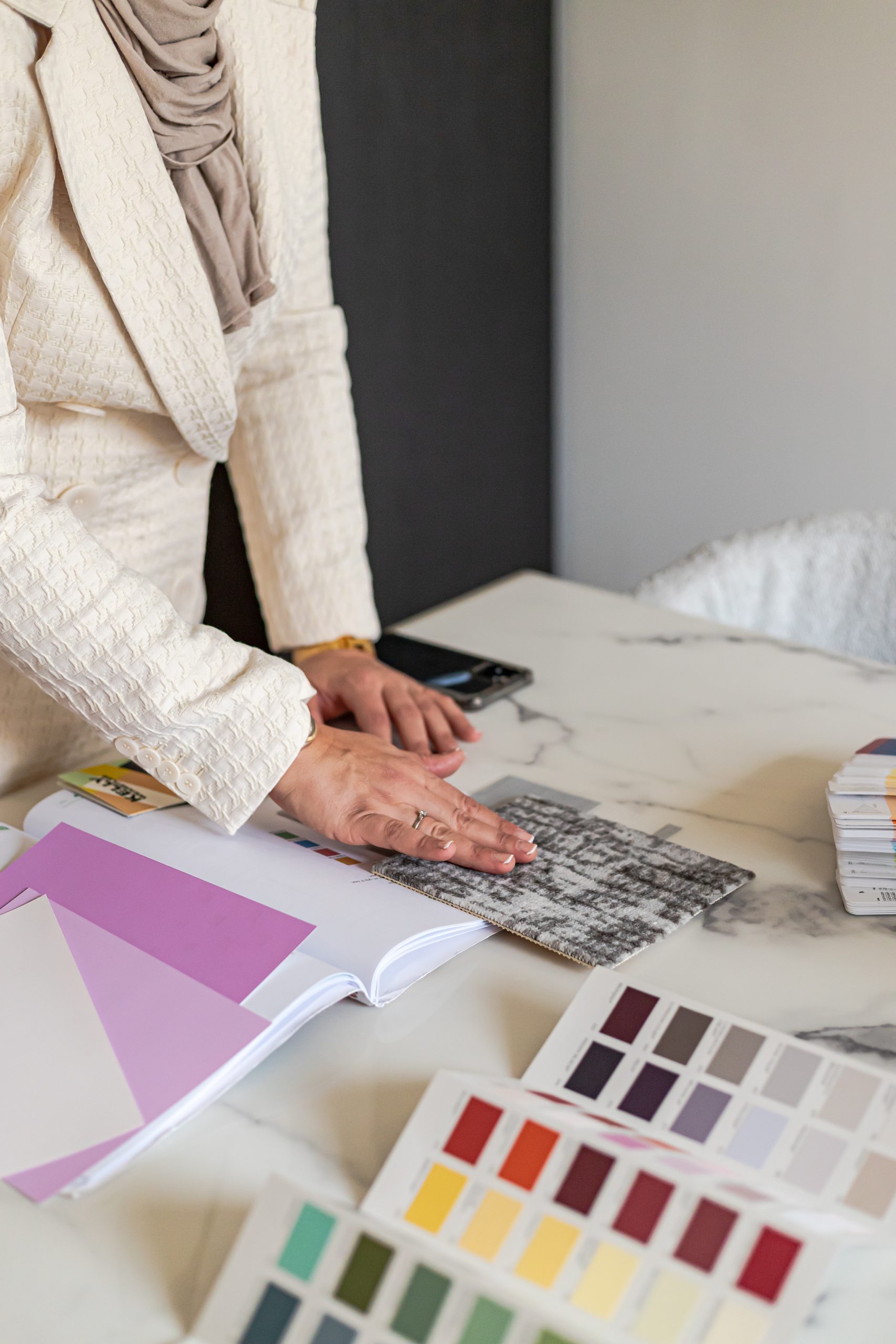 Aan de hand van enkele meegenomen stalen kunnen we meteen opties selecteren en keuzes maken. Zoals het bepalen van bijvoorbeeld een vloer, karpet, of raamdecoratie.